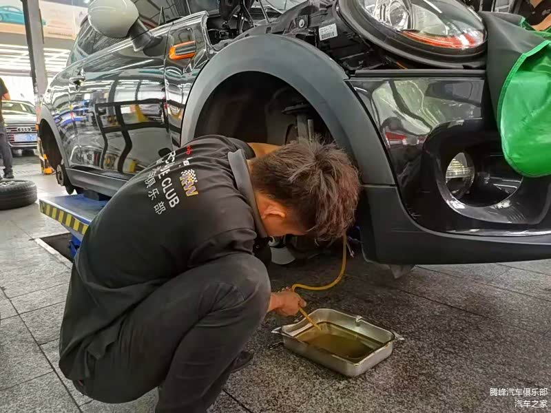 宝马mini采用重力放油法,把原有机油排放干净,放出来的机油又黑又脏,已经超过保养期有一段时间了。