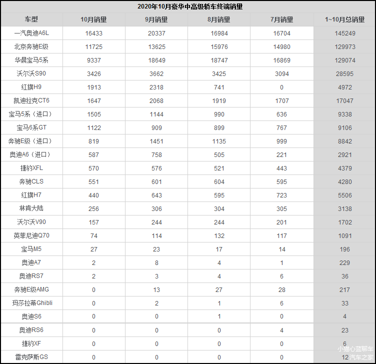 16433辆,一汽奥迪A6L延续着之前的良好状态;1~10月累计销量145249辆;终端优惠幅度大且认可度不低是A6L销量走高的重要原因;如果低配车型能够提升下主动安全配置,其销量还有进一步提升空间。进口A6的10月销量为587辆,1~10月累计销量2921辆;A7的10月销量为2辆,1~10月累计销量229辆;RS7的10月销量2辆,1~10月累计销量36辆。