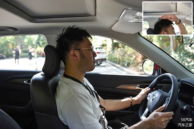 体验者身高180cm,入座后将座椅调至适合的姿态,此时头部空间剩余四指的距离。