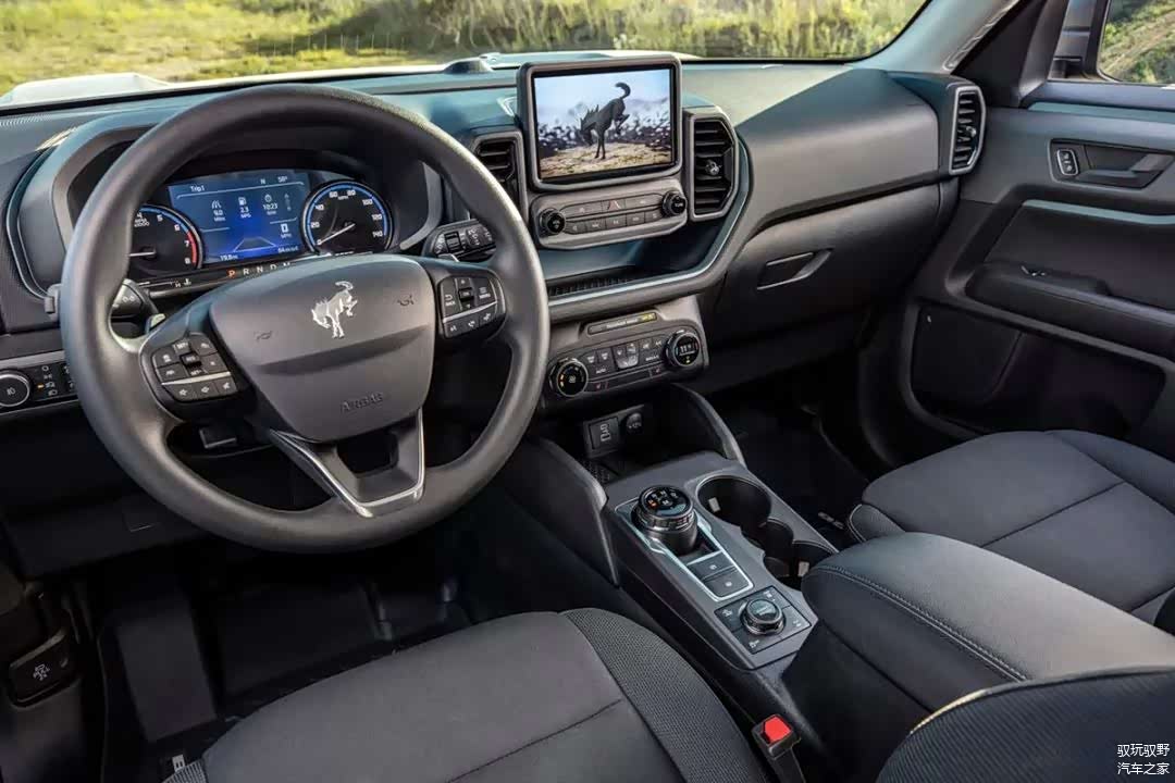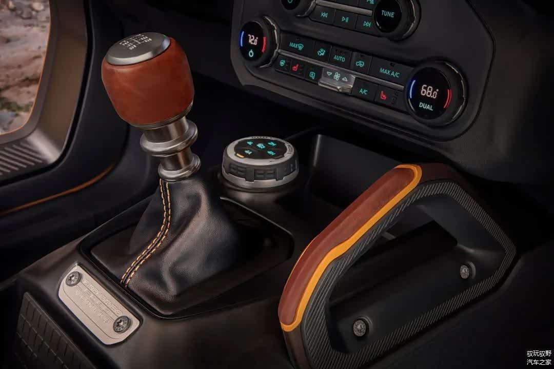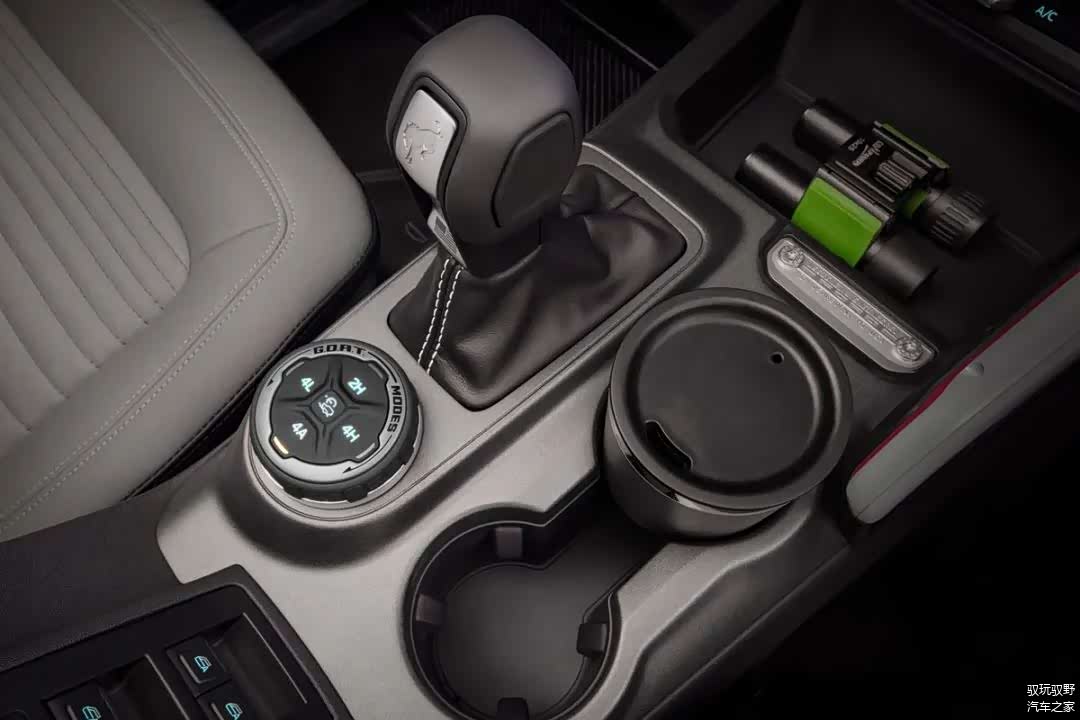 中控下方,从福特发布的官方图中可以看到,有旋钮式、握式的自动和手动档三种。仔细看,还能看到福特Bronco具备4H、4L、2H、4A和几种不同的驱动模式。