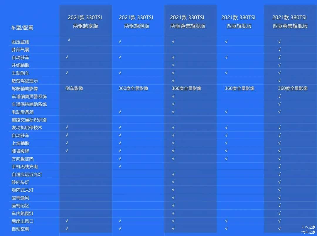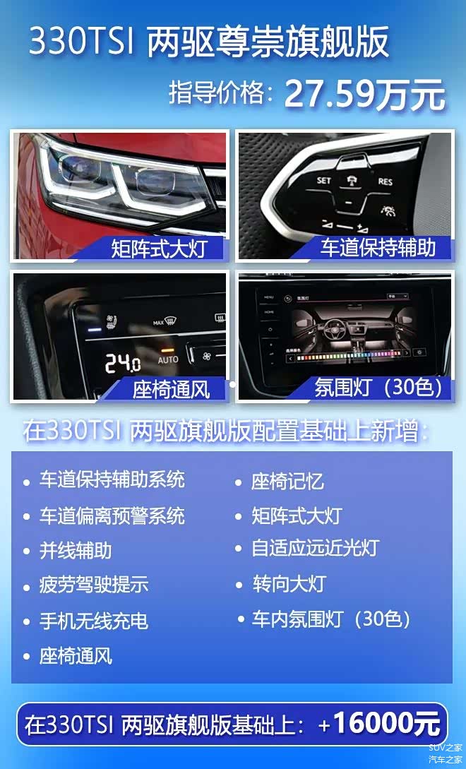 综合几款车型的配置对比,我们最为推荐27.59万元的330TSI两驱尊崇旗舰版车型。首先,作为两驱版车型的顶配,该车型比低一档的330TSI两驱旗舰版高出了1.6万元,但配置上却多出了车道保持辅助系统、车道偏离预警系统、并线辅助、疲劳驾驶提示、手机无线充电、座椅通风/记忆、矩阵式大灯、自适应远近光灯、转向大灯和车内氛围灯(30色)等一系列配置,其成本要高出原本的1.6万售价。