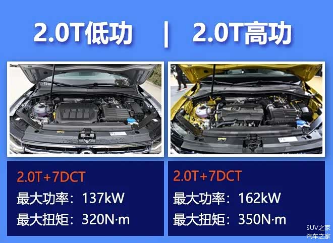 动力方面,途观X全系搭载的是2.0T动力,但有高低功率之分。其中,2.0T低功发动机的最大功率为137千瓦(186马力),峰值扭矩为320牛米;高功发动机的最大扭矩为162千瓦(220马力),峰值扭矩为350牛米。传动方面,与之匹配的是一台7速双离合变速箱。通过之前试驾途观L可以证实,这套2.0T+7DCT的动力组合在换挡平顺性上还是表现不错的。