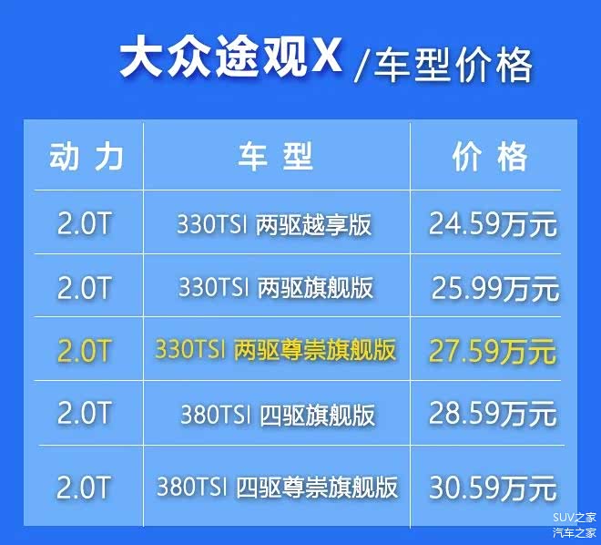 此外,330TSI两驱尊崇旗舰版相比四驱版本,虽然少了更强劲的动力和全时四驱系统,但价格上相比四驱尊崇旗舰版车型却便宜了3万元的价格。而且途观X作为城市SUV车型,越野功能实用性并不大,而2.0T的低功发动机作为日常通勤代步,也完全够用了。从性价比角度说,330TSI两驱尊崇旗舰版是最值得购买的。