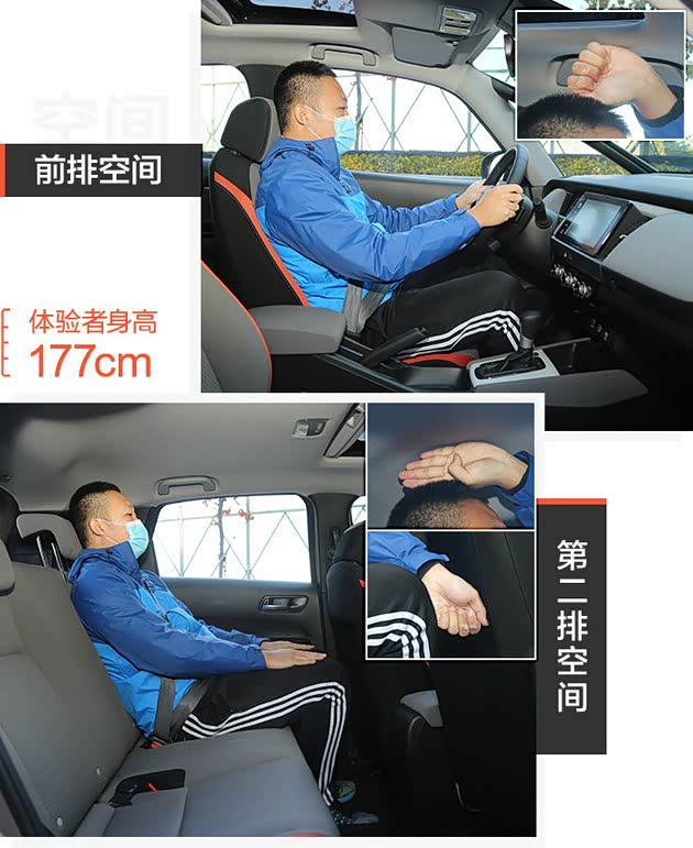 驾乘空间方面,身高177cm的体验者无论在前排还是后排都能获得比较不错的空间,这对于一款定位在小型车尺寸的车型来说,已经是很出色的表现了。