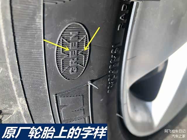 大家可以留意轮胎表面打刻的文字,这些原厂的字迹都是非常清晰的,但是,如果是后期处理过的轮胎,周边的字体就会出现打磨的痕迹,尤其是轮胎的出厂日期附近,轮胎上都有出厂日期!