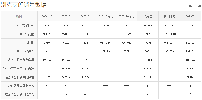 从销量数据可以看到,别克英朗在今年的10月份一共卖出了33789辆,从今年的1月份到10月份一共卖出了213192辆。其中,1.5L版本车型在10月份卖出了30821辆,1.3T版本车型卖出了2960辆,1.0T版本车型卖出了8辆。