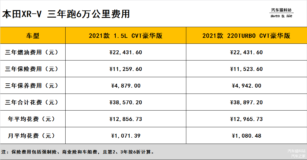 养车成本的组合多种多样,像车辆维修费、停车费、美容费、通行费等不可控因素也比较多,因此我们暂以燃油费用、保险费用、保养费用这三个方面来做计算,由于本田XR-V拥有两个动力版本,因此我们分别选取1.5L和1.5T两款豪华版车型,来进一步看看本田XR-V的实际养车表现。