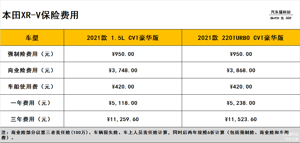 保险费用方面主要差异来源于车身价格以及所选择的险种,那么本田XR-V的表现如何呢,我们通过下表可得到答案: