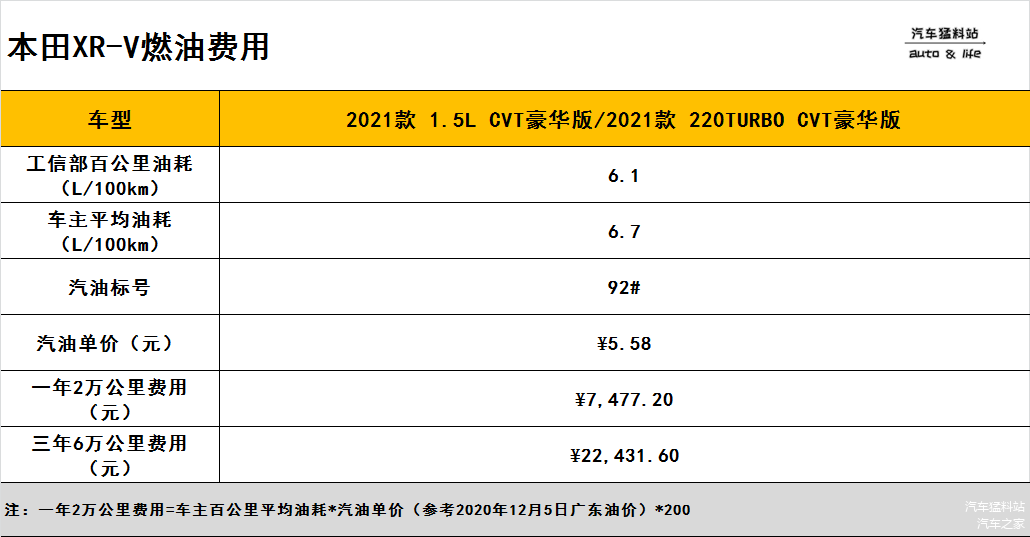 由上表可以看出,本田XR-V如果一年跑2万公里,参考车主平均油耗的话,两个动力版本的燃油花费金额均为7477.2元,三年加总为22431.6元。