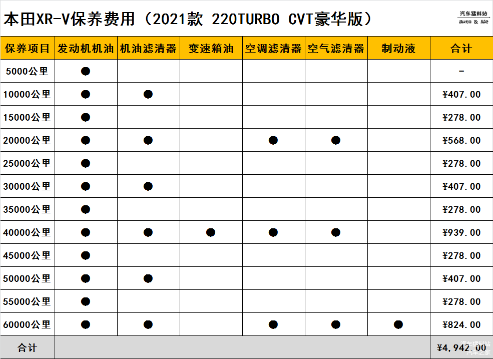 本田XR-V正常情况下的保养周期为5000公里或半年,并且首保免费。以此计算的话,三年跑6万公里的到店保养成本如下: