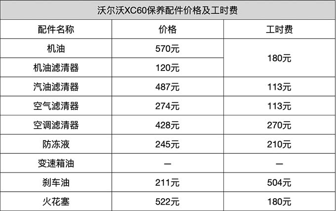 工时费方面更换机油机滤价格180元、火花塞180元、空调滤芯113元、刹车油504元,结合沃尔沃XC60较长的1万公里保养周期和适中的配件价格,这两项的表现还是能够让大家接受的。