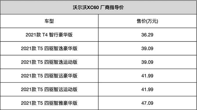 目前在售的沃尔沃XC60共有6款车型,其中包括1款低功率T4车型和5款高功率T5车型,厂商指导价格区间为:36.29-47.09万元。据悉目前买的最好、现车最充足的是2021款 T5 四驱智逸 豪华版/运动版车型,该车厂商指导价格39.09万元,配置、动力、价格等等各方面表现都更加均衡。