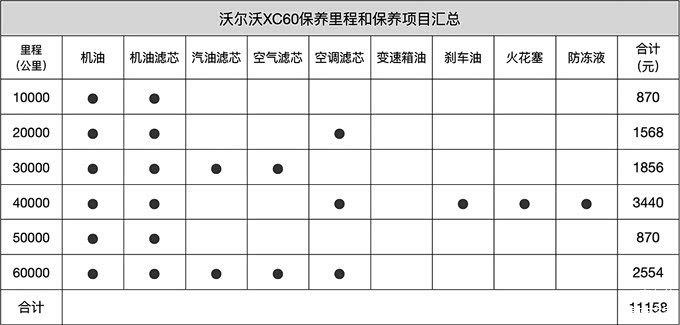 总结:最终沃尔沃XC60车型行驶6万公里的保养的总费用为11158元,小保养(仅更换机油机滤)价格为870元,最贵的一次保养在4万公里时,除了机油三滤外还需要更换刹车油、火花塞和防冻液,价格为3440元。总体来看沃尔沃XC60车型的保养价格在同级别中属于中等水平,略低于BBA、略高于凯迪拉克。