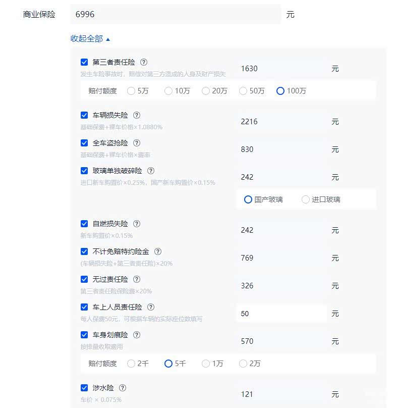 买车还必须买保险,下图中为车辆全险,如果觉得没有必要的话可以自己减去一些相应的费用,但是如果是新手的话,有时候全险还是很有必要的,保险经过了改革,每个人不同时间算的价格都有所不同,还要以自身实际为准。