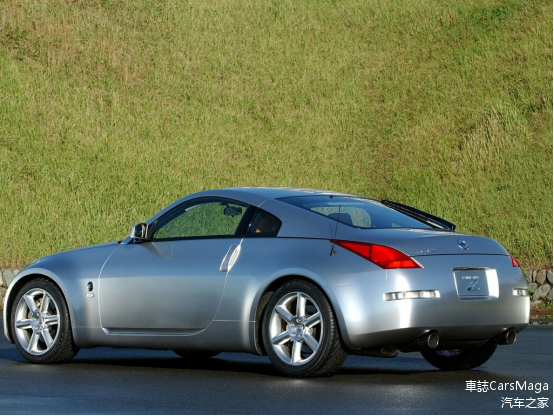 在2002年的夏天,350Z正式登场了,这台车受到了十分广泛的好评,车架平台来自日产的新一代Skyline的FM底盘,但轴距只有2650mm,前后配重比为53:47,这在FR布局的车型里已经算是非常完美了,但如果能效法CBAR35那样采用后轮驱动桥的布局,相信很容易能达成“前轻后重”的更完美,不过这个成本太高,在目标售价内是很难实现的;悬挂则为前后多连杆形式,但前悬挂所谓的多连杆形式其实应该是双摇臂,只不过日产的工程师将上下摆臂换成多个独立杆件,此举最大的好处是能稍微节省一些占地空间。它搭载的3.5公升VQ35DE引擎,采用V6构造,和DOHC的配气机构,这台引擎在日产多台车上也采用过,包括Skyline、FUGA、Pathfinder等。