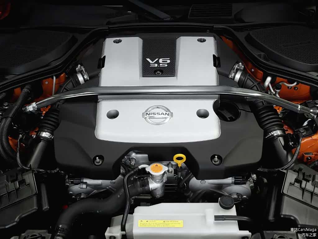 图:改款后的350Z发动机也有不少的变化,其中最明显的就是由单进气改为了双进气,动力输出更为优秀。