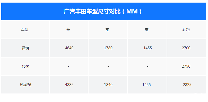 两款车型的长宽高尺寸对比:雷凌 4640/1780/1455mm 轴距为:2700mm,凌尚轴距为: 2750mm, 凯美瑞4885/1840/1455mm 轴距为:2825mm。