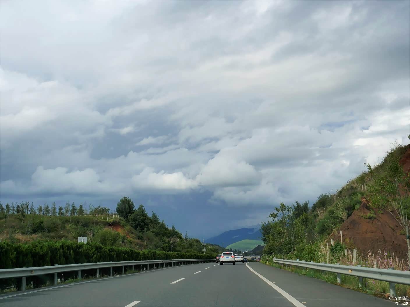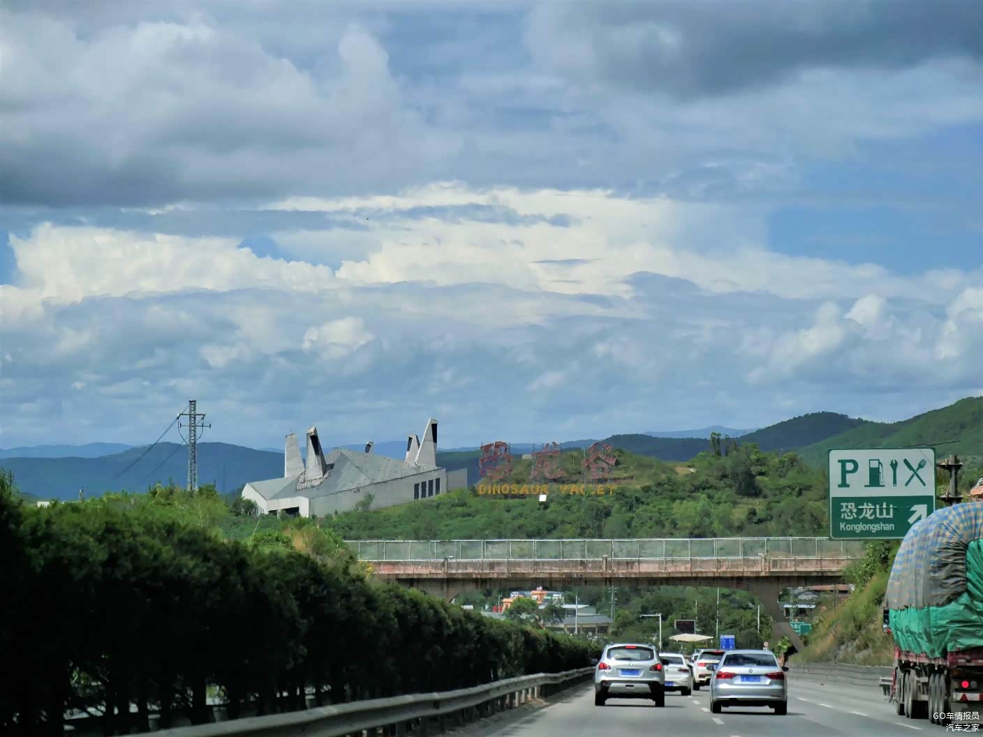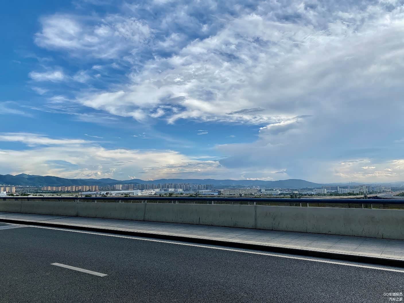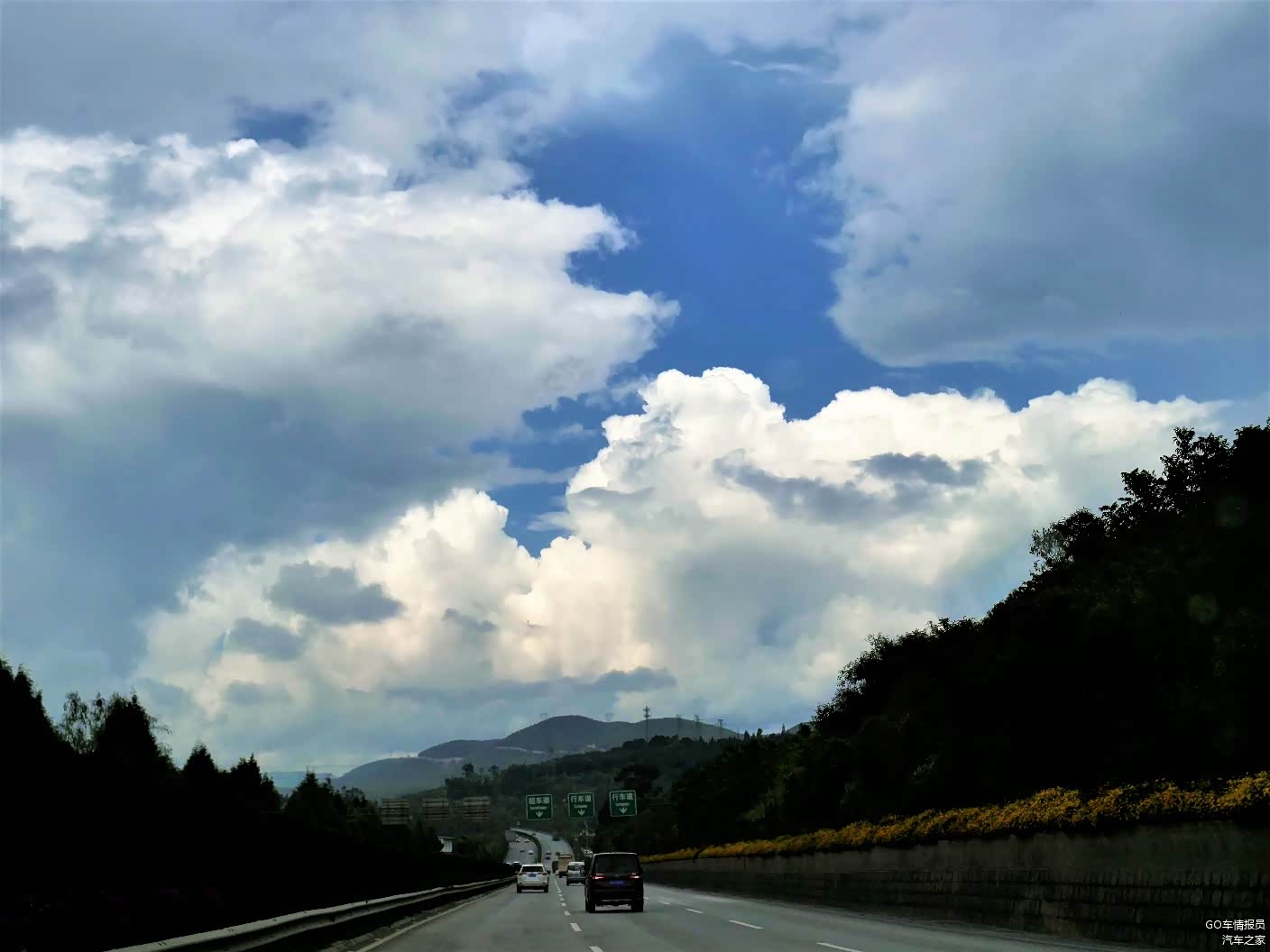 在服务区吃饱喝足后接着一路前行,天空中的白云逐渐的多起来,偶尔还来一阵太阳雨。