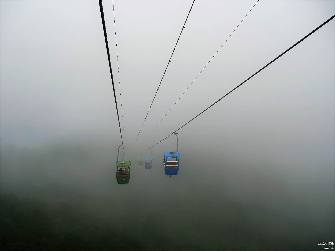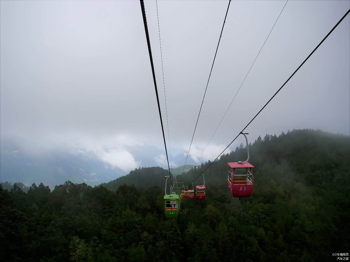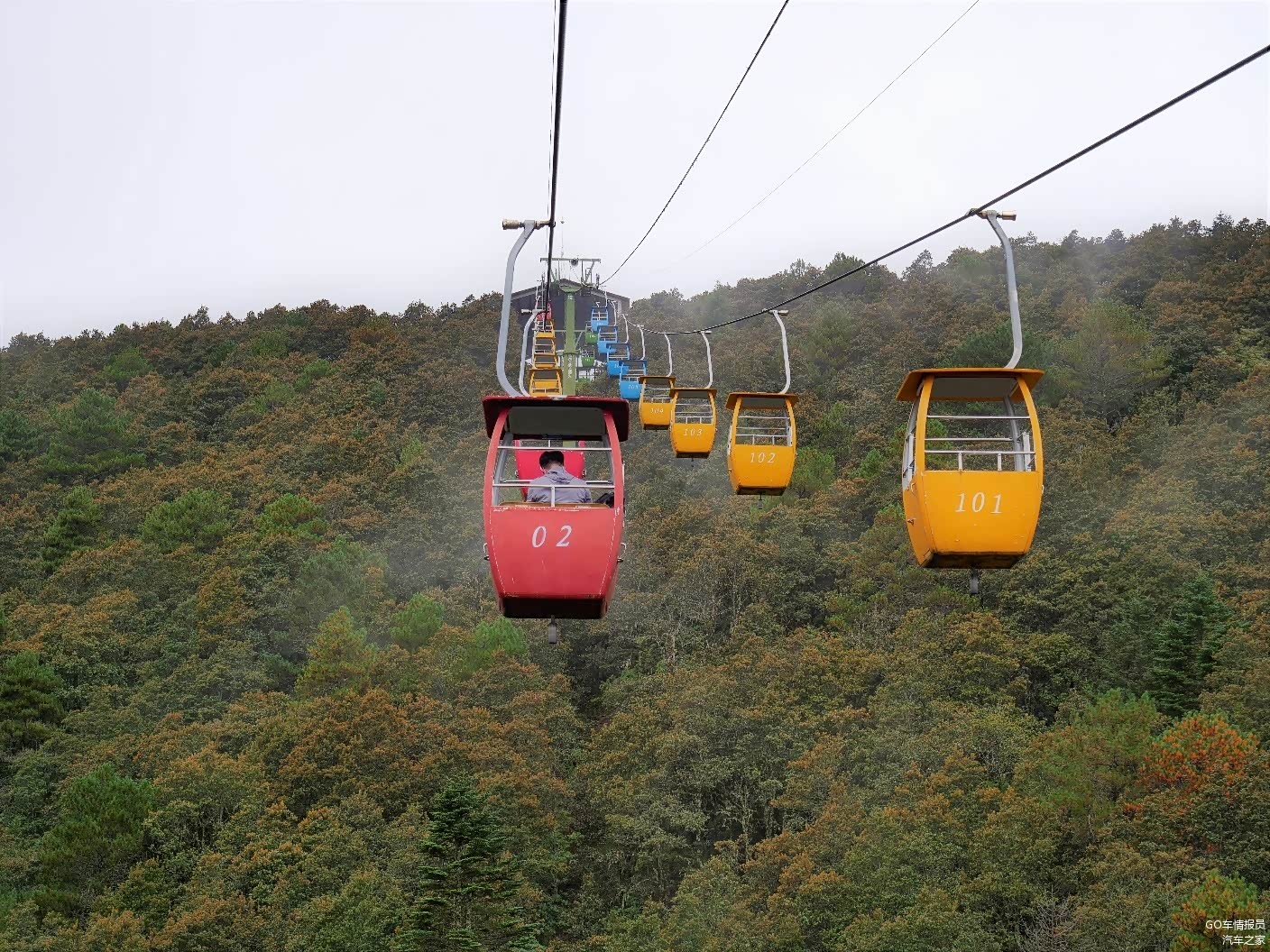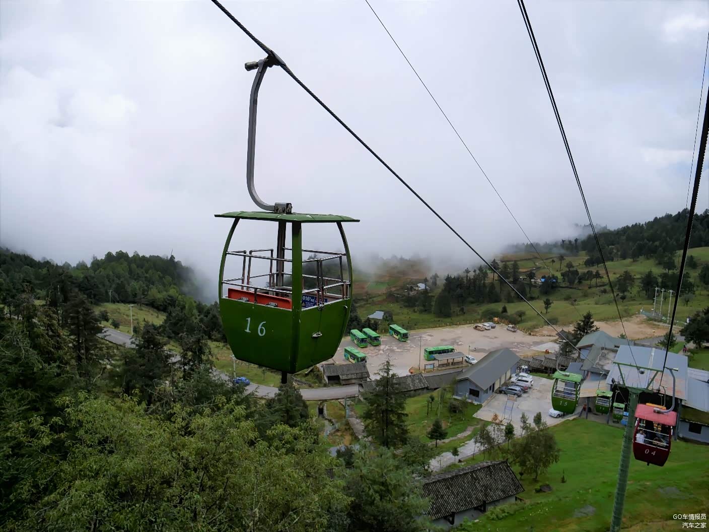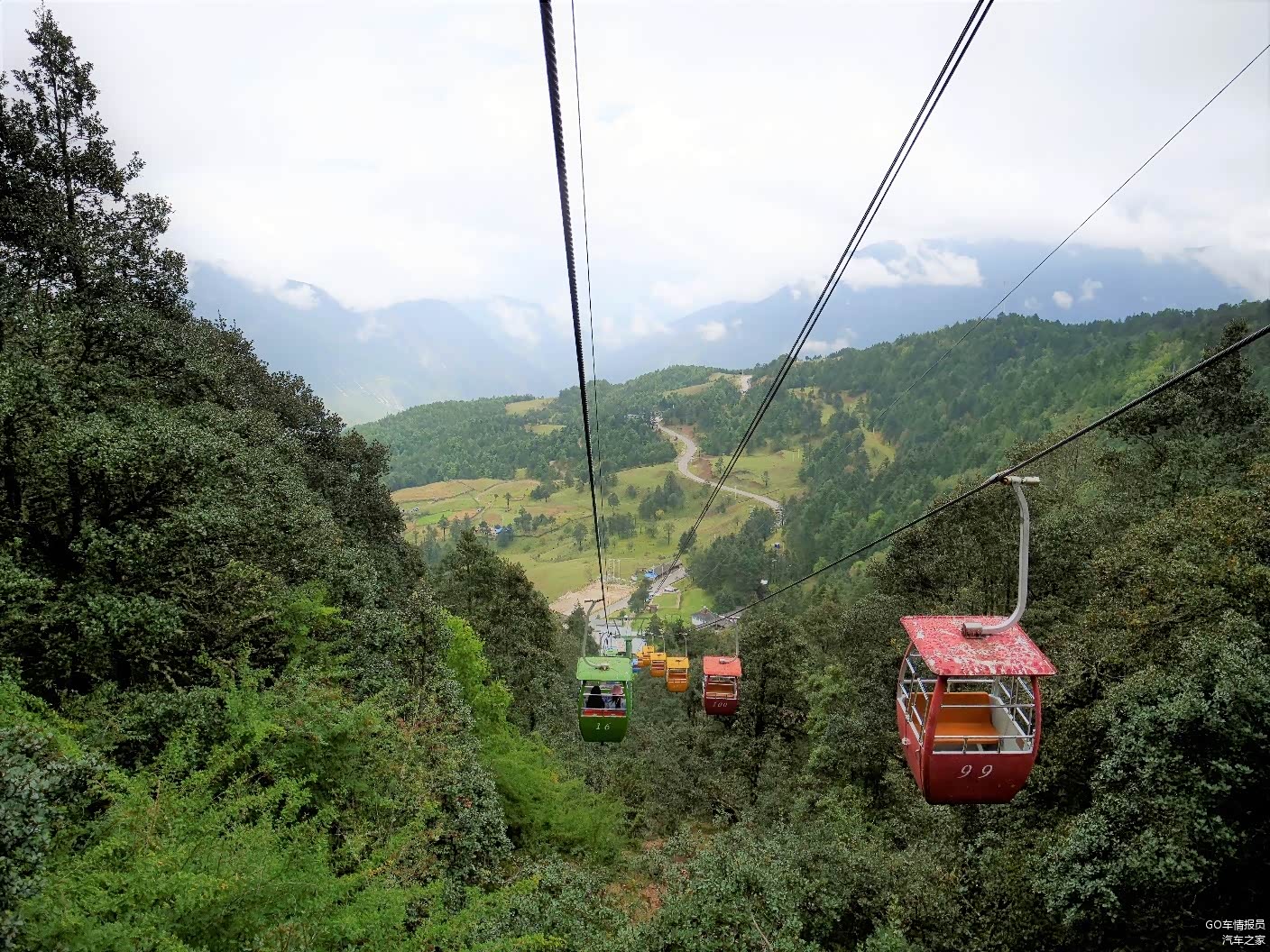 牦牛坪的索道全长1.2公里,属于双人吊篮式,上达高度为海拔3500米,单程需20分钟。今天天气不好,再加上索道的吊篮不是封闭的,在半空中小风一吹,冷嗖嗖的,不过沿途的景色很好看。但看这个雾蒙蒙的天,感觉看到雪山的希望不大。