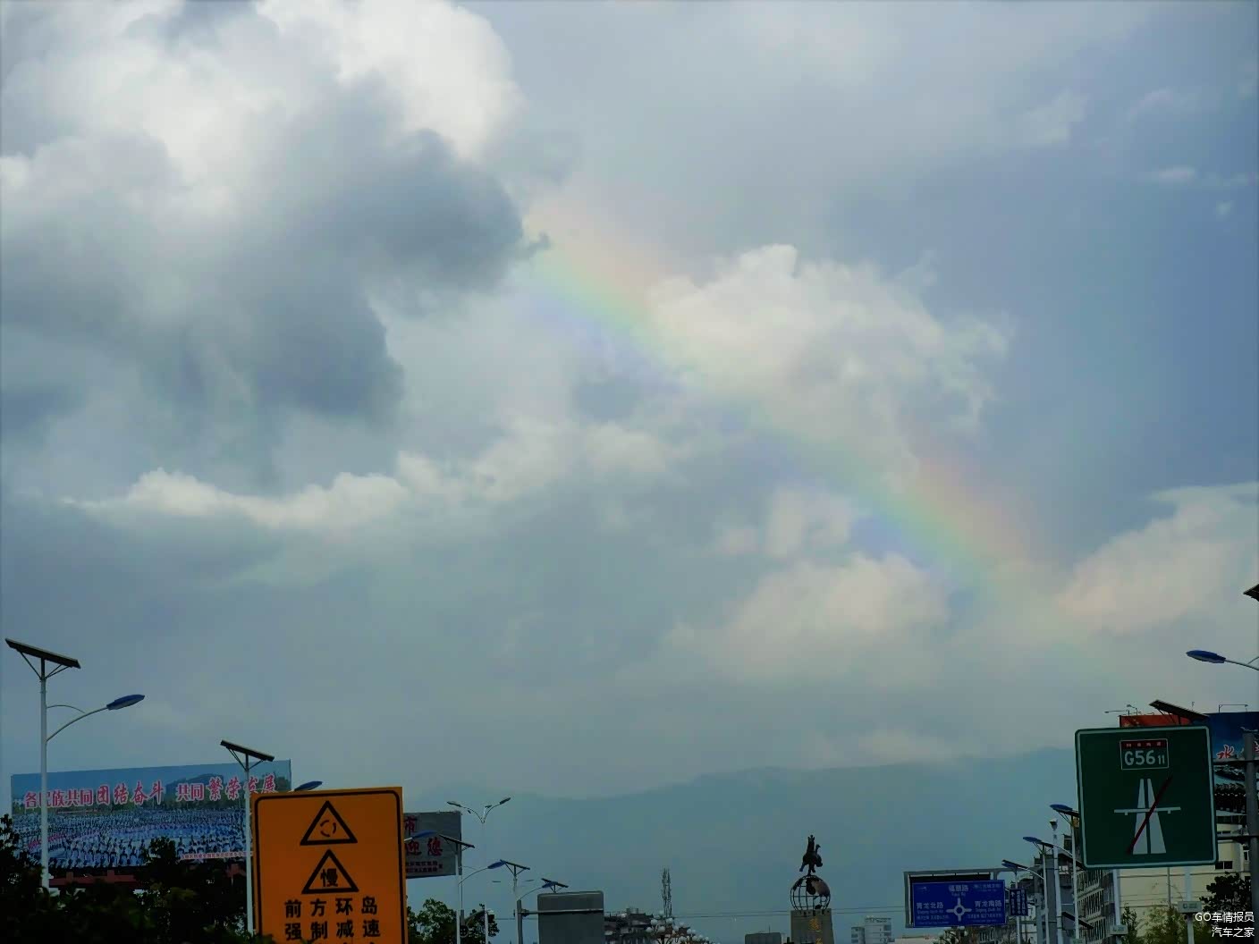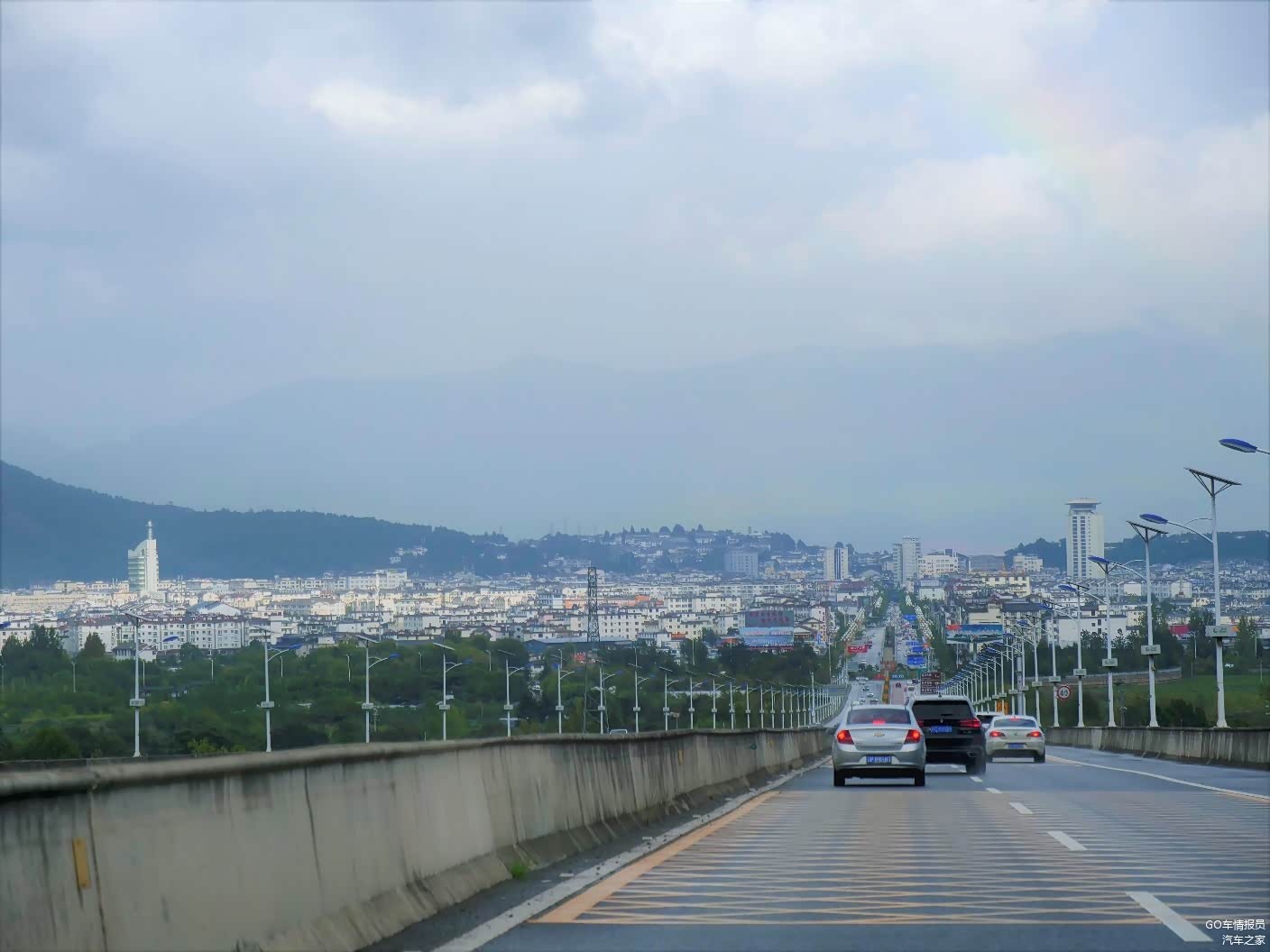 出了高速快到丽江城区的时候,天空中出现了一道彩虹,虽然看不到远处的玉龙雪山,但是若隐若现的彩虹还是让我们的心情变得晴朗起来。