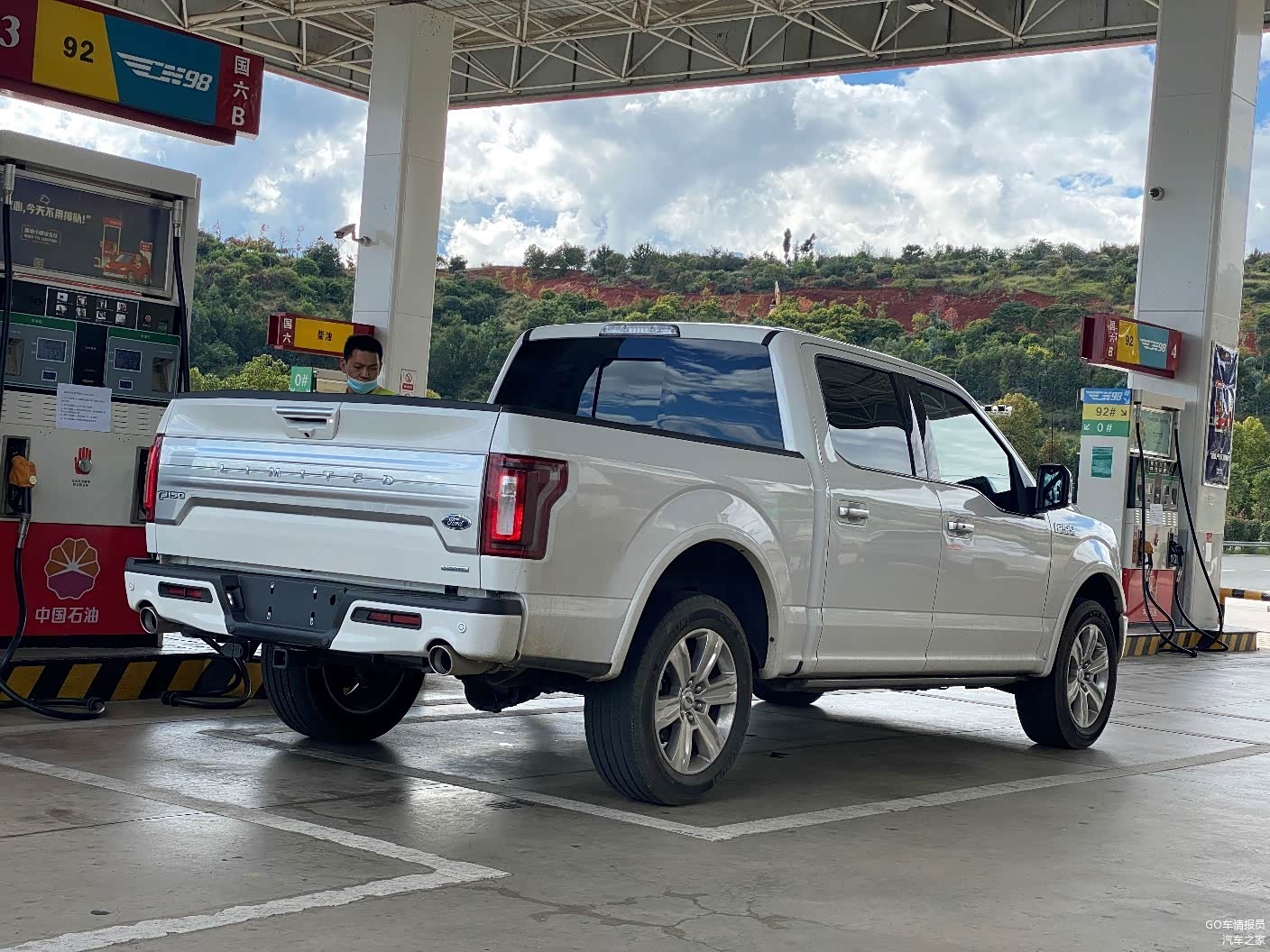 路上顺便加了个油,看到一台还没上牌的福特F-150 LTD,从这个角度看,显得有些普通。