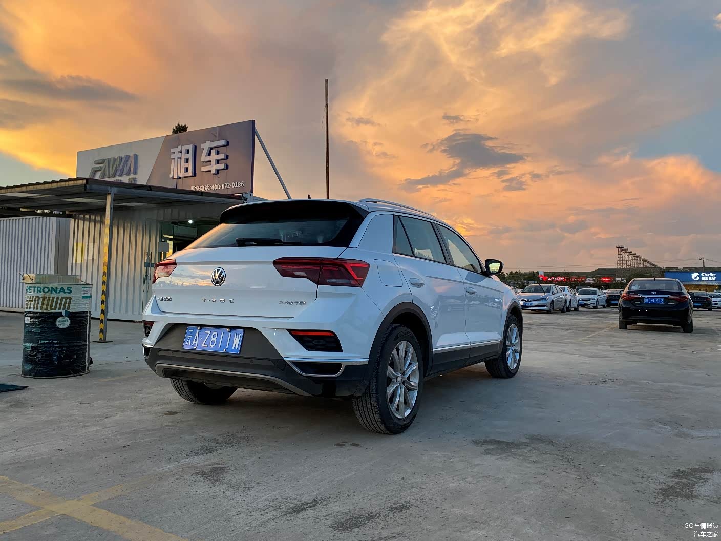 取车的地方在机场附近不远的携程租车中心,选的租车公司是一汽租车,可以看做是一汽官方的租赁平台,基本上以一汽-大众以及一汽奔腾的车为主,可是来接我的小哥却开了一台一汽丰田的卡罗拉,在路上一直问我觉得卡罗拉怎么样,我说卡罗拉蛮好的呀,然后他就说要不把你订的嘉旅换成卡罗拉?我寻思原来在这儿等着我呢?我说,不好意思,因为这次出行,我们有四个人,都带了大号旅行箱,如果换卡罗拉,估计后备厢放不下行李。于是他不好意思的说,由于十一期间,大部分店里的车都被租出去了,我预定的那台嘉旅因为到了保养里程,被送去保养了,如果我不介意的话,可以等一等,等另外一个客户在18:00左右来还一台T-ROC探歌,可以把我的嘉旅换成探歌,考虑到探歌的后备厢足够放得下四个大箱子,我同意了。