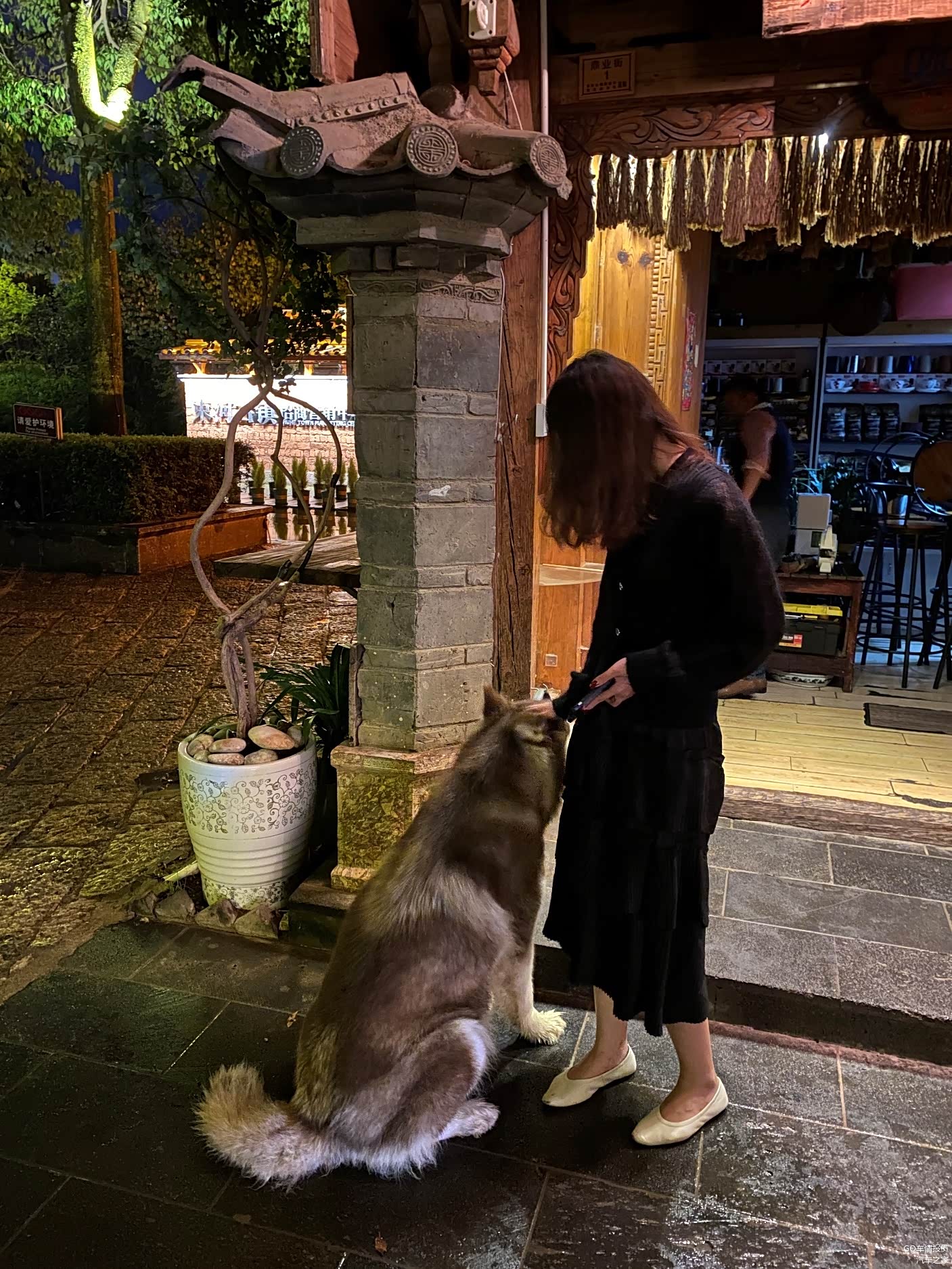 既然住的地方离束河古镇近,当然首选就是逛束河古镇了,本来以为人会很多,结果来了一看,简直不要太冷清,古镇门口那家咖啡店的招牌狗狗阿拉斯加都有点寂寞了,不停的在程老师身上蹭啊蹭。
