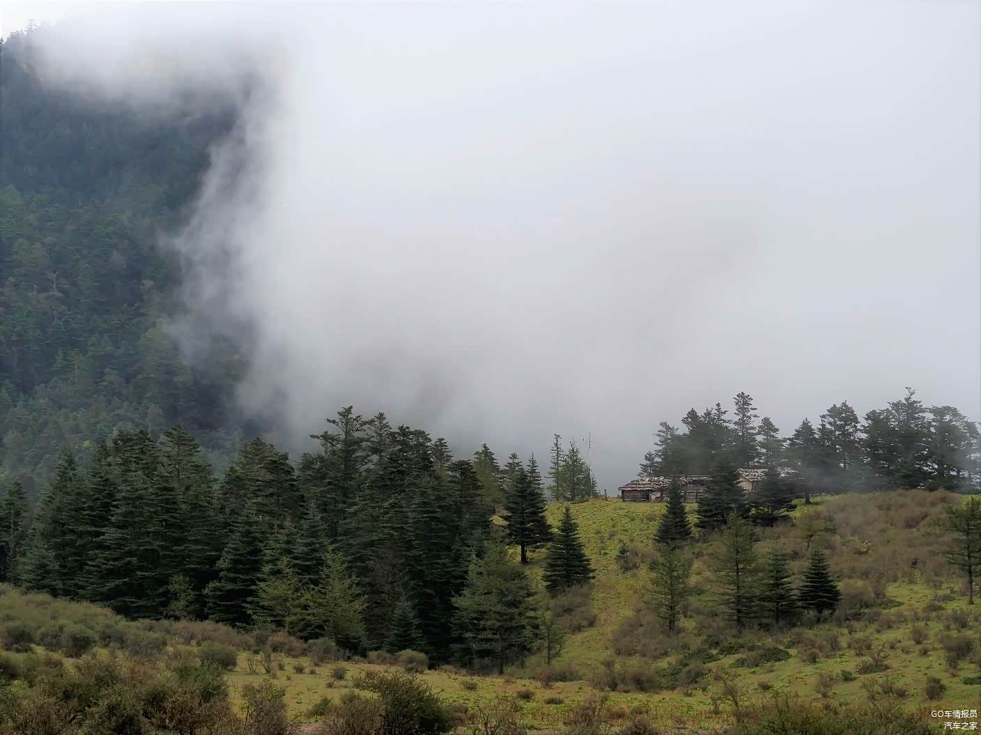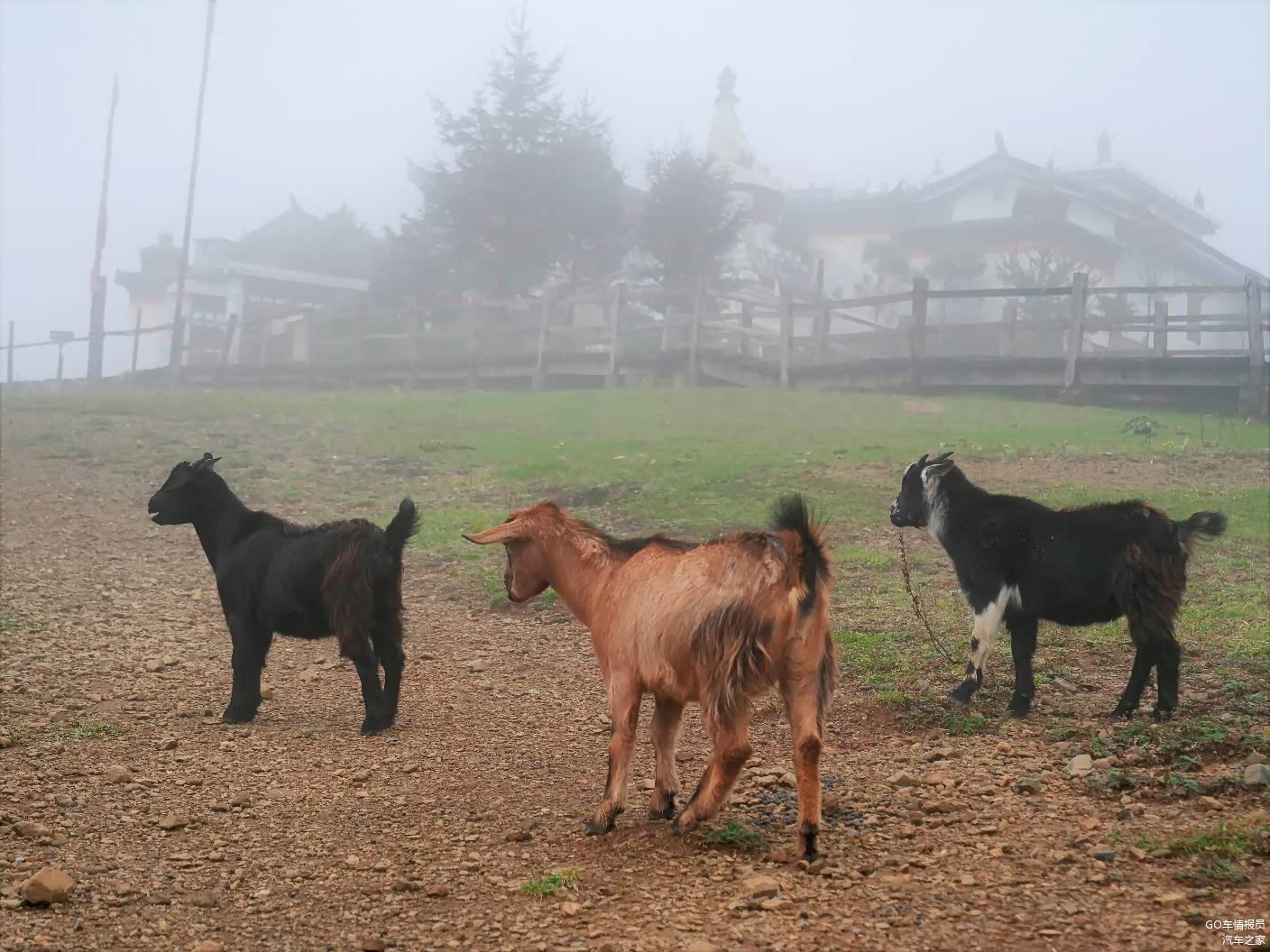到牦牛坪的气压海拔已经是3355米了,雾蒙蒙的一片视野独特,牦牛没看到,羊咩咩倒是不少。