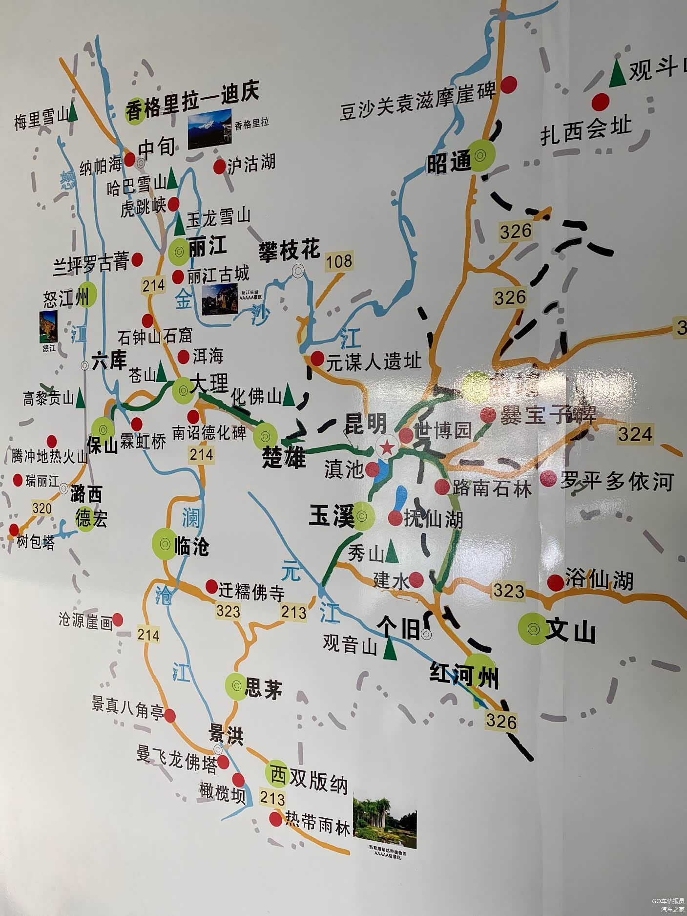 取车的时候,还看了下租车行里的云南旅游图,一路上的景点还是蛮多的,只是对于程老师来说,似乎网红打卡点的吸引力更高一些。