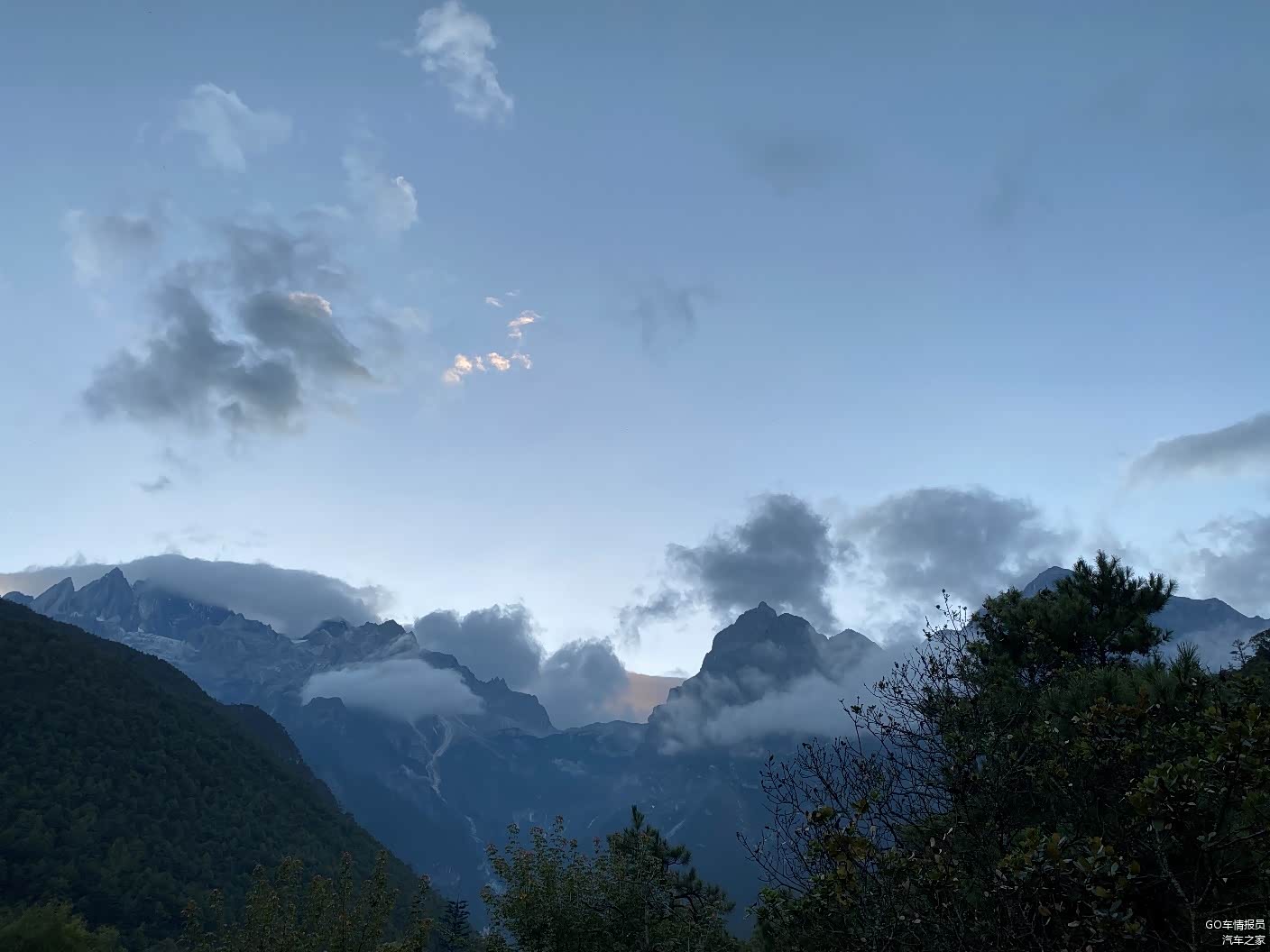 从蓝月谷下来之后,玉龙雪山慢慢的露出了真容,但是天也慢慢的黑了,远处的丽江城区灯火阑珊。