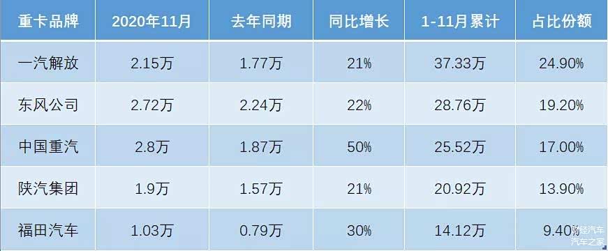目前,福田戴姆勒已拥有90多万用户和800多家经销商,产品涵盖欧曼ETX、欧曼GTL、欧曼EST、欧曼EST-A四大系列,包括牵引车、载货车、自卸车、各类专用车等200多个品种。官方数据显示,1-11月份,欧曼累计销量超过12万辆,同比增长超过55%,增速在中国的重卡行业排名第一。