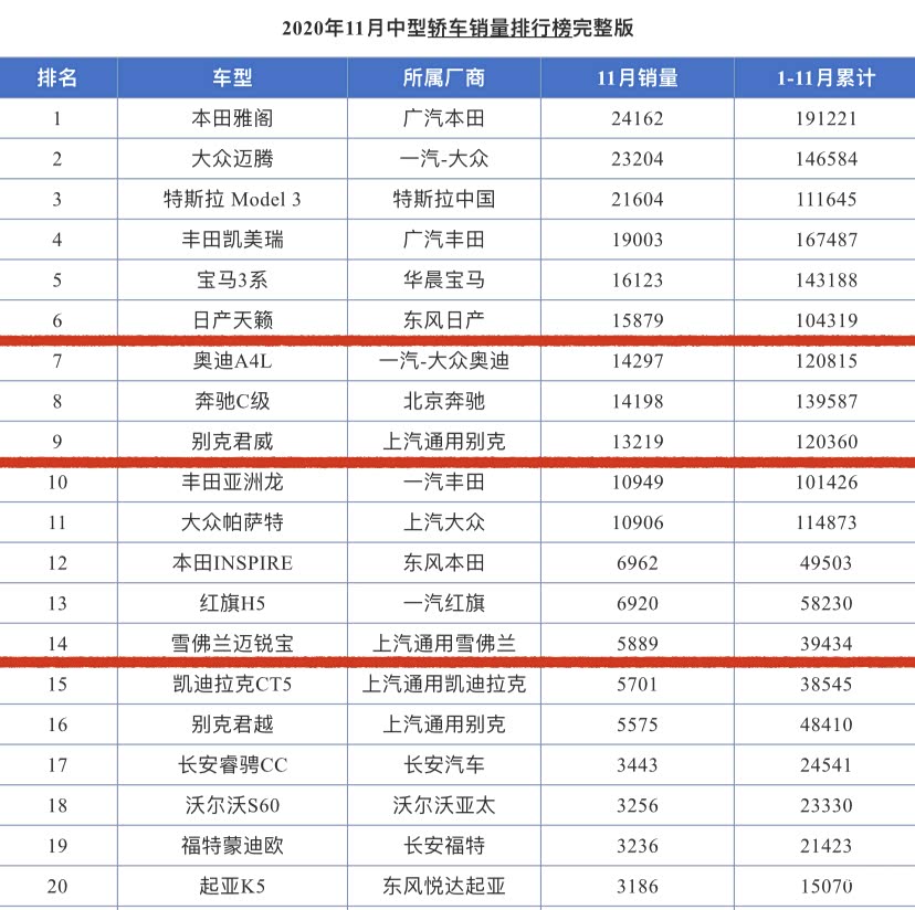 那么现在新一代的屌丝三宝都有哪些车型呢?我认为要想获此殊荣,必须满足以下几个条件。首先在中级车中销量还说得过去, 否则太冷门“屌丝”们也不会关注。再就是这款车实际价格要相对偏低,同时性价比看起来又要很高,让人有种买它就占了大便宜的感觉。翻看2020年11月中级车销量榜单,我认为这两款车有望取代曾经的韩系,成为“新三宝”中的一员。