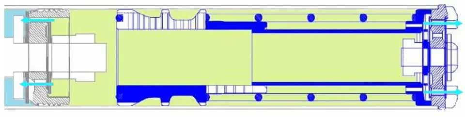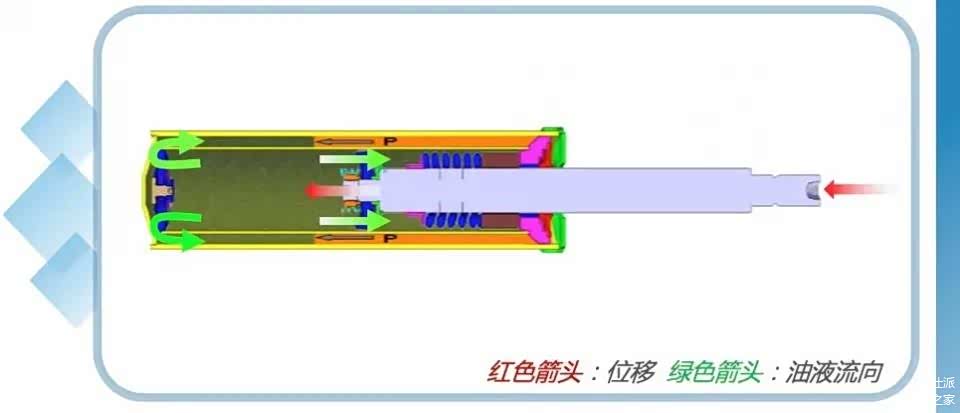 跑到烂路上的时候,对于车辆来说会先感受到颠簸,悬架的上下摆动幅度增加,此时,减震器开始经受考验,活塞开始接触渐进式液压缓冲器,轮到PHC干活了——避震筒内两侧的油液阀成为油液流通的通道,活塞向下压缩的过程中,开始吸收机械能,减震器由于被加压,因此阻尼持续增大,使悬架对震动的吸收能力增强,防止刚性冲击的产生。用通俗话讲就是:不能轻易让减震器一撸到底。