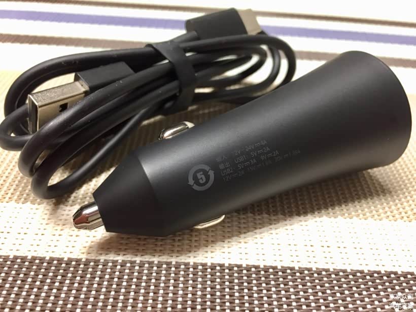 Δ 随机附带的USB-A转USB Type-C数据线,和车载充电器,这里车载充电器的技术规格是,输入12V-24V/4A,输出USB1是5V/2A,USB2是5V/3A,9V/2A,12V/2A,15V/1.8A,20V/1.35A,支持的输出非常之多,也证明这是一块快充车载充电器。