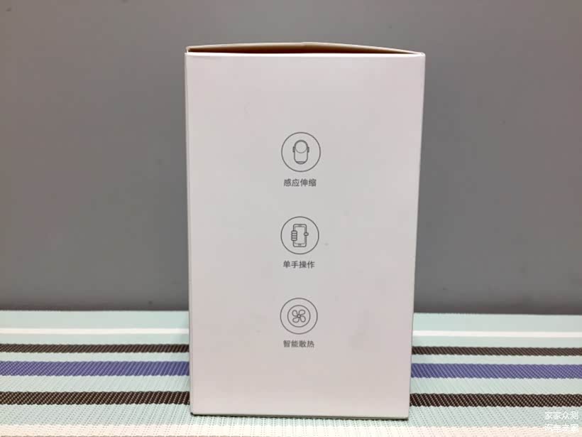 Δ 包装侧面的简单介绍,感应伸缩和智能散热非常吸引我,看到风扇的图标,说明这里是主动散热方式,里面增加了一个风冷风扇。