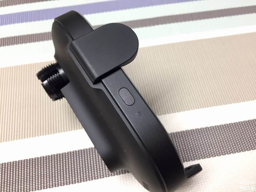 Δ 背部的万向球,锁紧后即可把固定夹固定在出风口扇叶上。底部是散热空,里面配有主动散热风冷风扇。无线充电后才会开启风扇转动,噪音可以忽略不计。