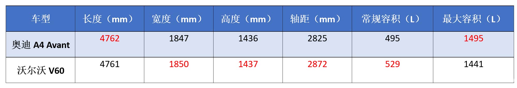 选择旅行车,最看重的莫过于后备箱空间了,两款车身尺寸上非常接近,在空间上却各有所长,V60常规储存空间比A4 avant大出了34升,但将后排座椅放倒的最大空间上,A4 avant大了足足54升(座椅靠背更直)。不过放倒座椅后,A4 avant没有V60的地台平整。