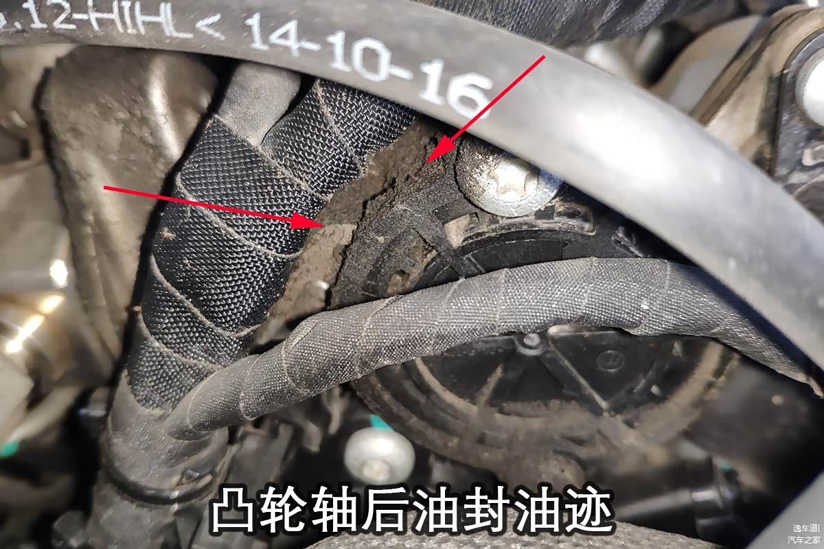 然后在凸轮轴后油封的位置我们同样也发现了渗油、漏油的痕迹。大众嘛,漏漏更健康~
