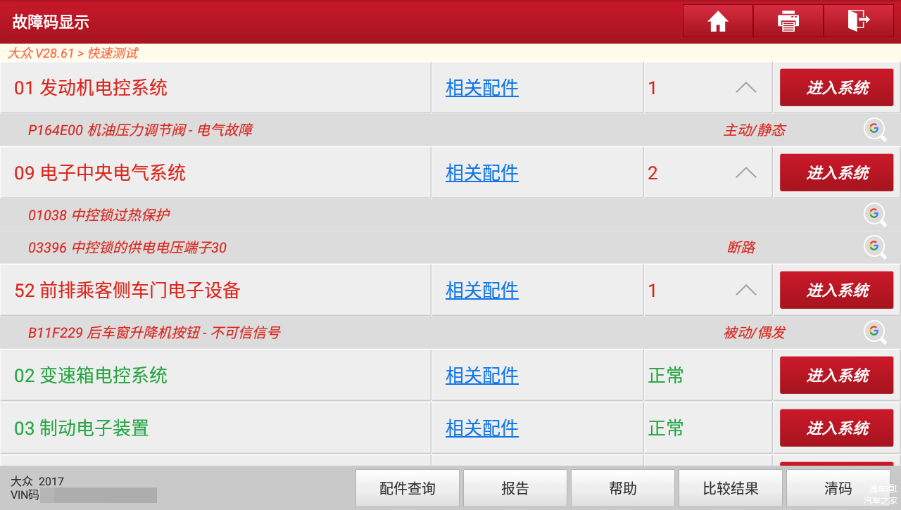 OBD检测读取车辆故障码的时候本来有两页都都是红的,包子看了下有好多都是因为电瓶亏电所致,现在我们将故障码清除之后重新读取发现还存在三处故障信息,那这肯定就是实实在在的故障了。
