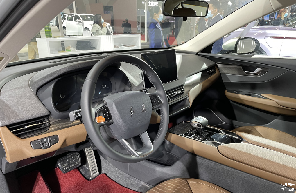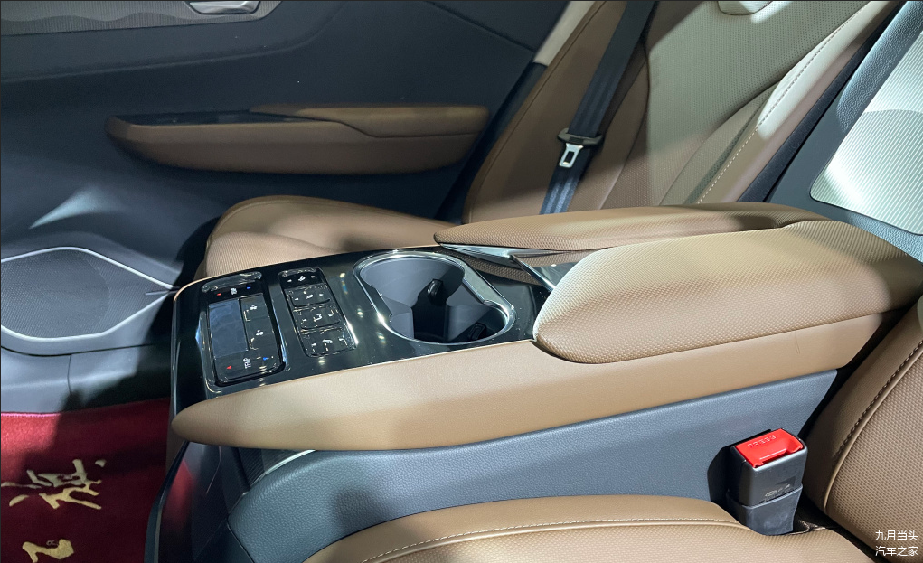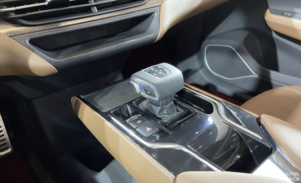 新车的内饰方面;它的内饰主打色是以黑色为主,操作台应用的是黑色软包材质布满了整个前台,很有质感,下方应用的香槟色调进行镶接承托。一台悬浮式大尺寸触摸式多媒体屏,很具有吸引力;下方有一个储物槽,非常具有人性化设计。座椅采用的是皮质材质色调以香槟色为主,采用的是缝纫打孔设计,具有舒适的透气效果。中央扶手采用的是几何图形设计拼接,大气的造型搭配上香槟色皮质的包裹,档杆区域采用的黑色烤漆工艺,档把还拥有”P“键,一按驻车功能。