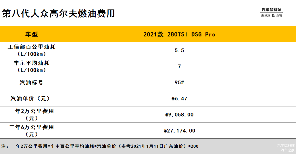由上表可以看出,假设高尔夫一年跑2万公里,三年跑6万公里,那么年燃油花费为9058元,三年花费27174元。