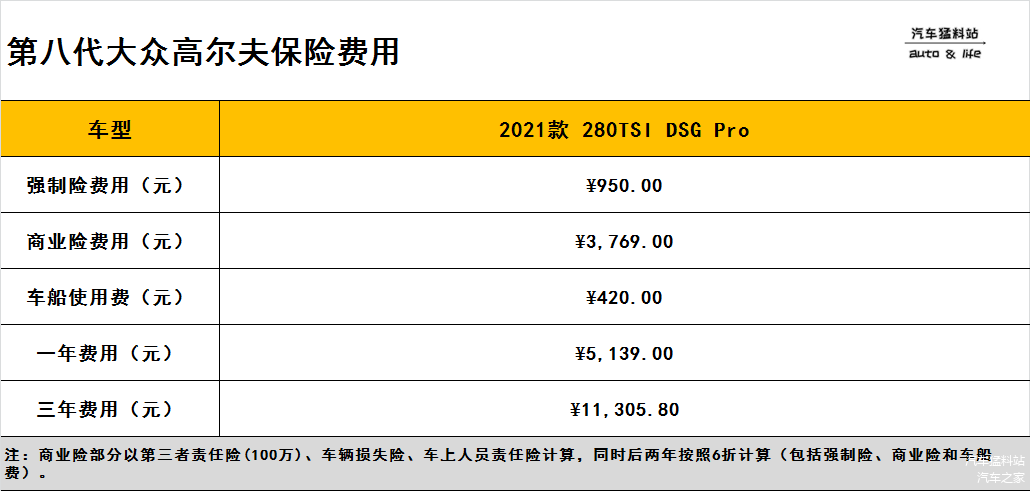 保险费用与所选择的车型关系不大,与车身价格和所选择的险种关系更加密切,而高尔夫的保险费用预估如下: