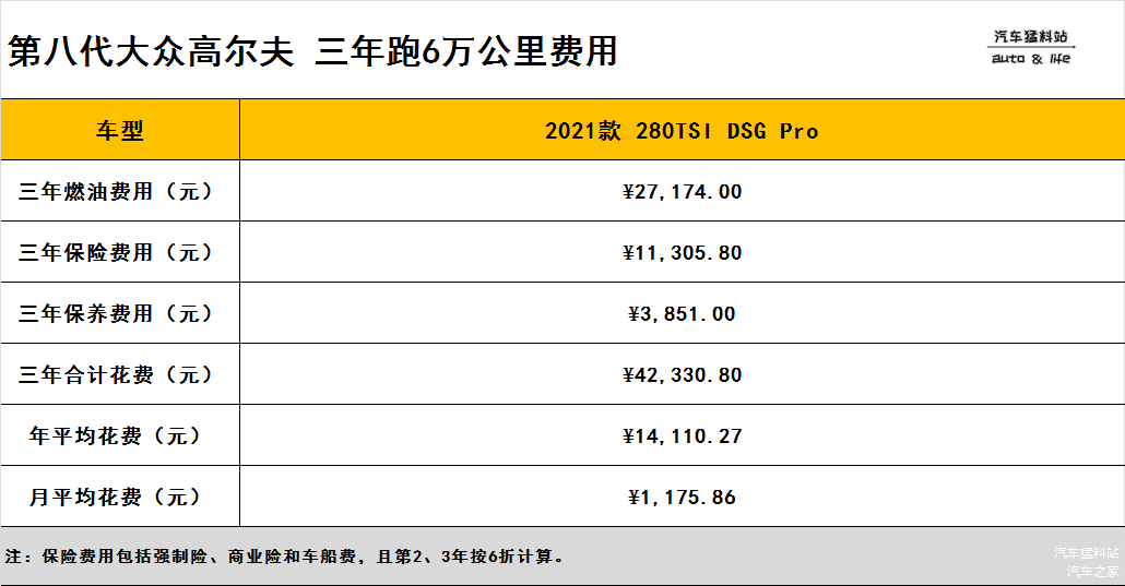 通过上述计算,我们就能得到第八代高尔夫的养车成本,结果如下: