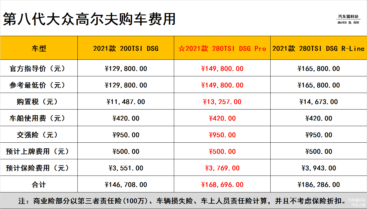 刚上市的第八代高尔夫毕竟不是高尔夫GTI,因此用车场景更多在于家庭,这时养成成本表现就显得比较重要。那么,第八代高尔夫的养车成本如何呢?我们仅以燃油费用、保险费用、保养费用这三个维度来进行计算,并以小编推荐、指导价14.98万的280TSI DSG Pro版作为分析车型。