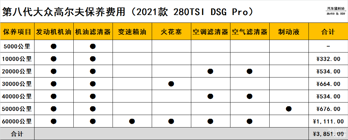 从上表可知,三年跑6万公里涉及的保养项目包括发动机机油、机油滤清器、变速箱油、火花塞、空调滤清器、空气滤清器、制动液等,含工时预估费用为3851元。