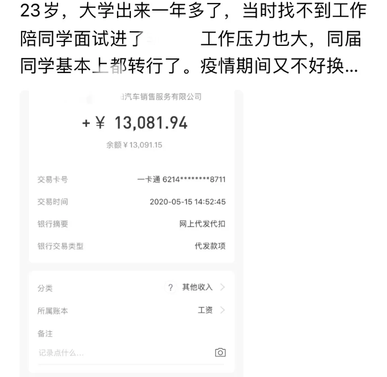 最近有一位23岁的汽车销售就晒出来了自己的月收入,大学刚刚毕业一年多的他因为找不到工作,于是被迫选择了汽车销售的行业,不过这一行人口流动是比较大的,所以很多同时进入这一行的同学们都已经放弃了,但是自己还在坚持,因为疫情期间确实很难找工作,作为一个正儿八经的本科大学毕业生,其实做汽车销售的还是少,虽然辛苦,但是工作没有含金量,而且主要是靠嘴皮子,唯一的慰藉就是月收入比较多 ,一个月行情好的时候能拿到1万多的工资,但是毕竟不是长久之计,汽车行业销售都是年轻化的,所谓升职也就是销售经理了,有的销售经理可能工资还没销售高,再往上就没什么空间了,因为4S店就这么大,架构层级不会复杂,更有很多4S店是家族企业,那就更没前途了,店总这个职位想都不要想,不可能的,所以入这行可能就是一辈子销售。