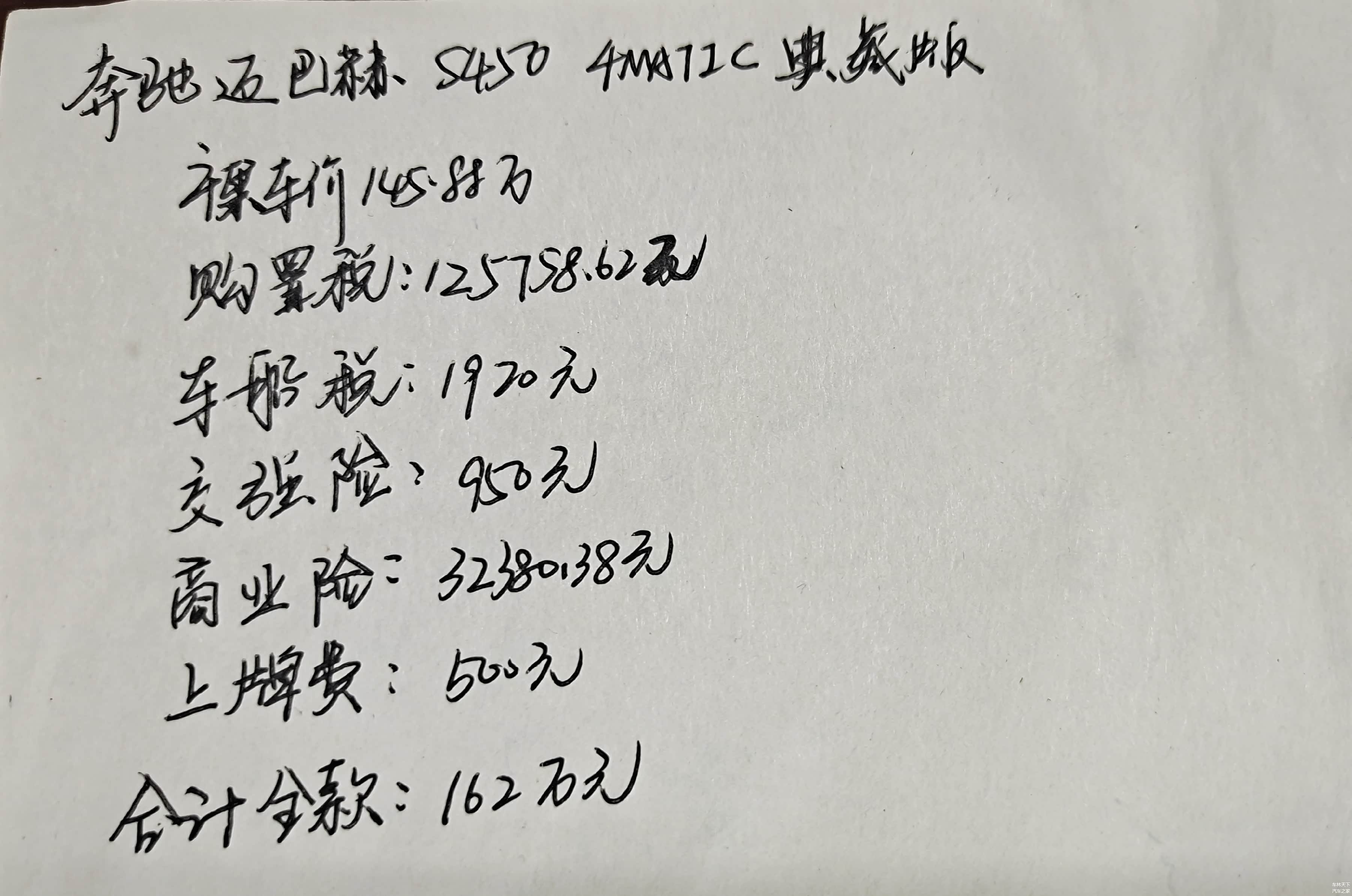 整体来看,这绝对是一台不可多得的好车,但是以这位网友的情况来看,想买它确实有点困难,先来看看如果想全款购买的话,裸车价145.88万,加上购置税、车船税、保险等杂七杂八的费用,落地需要花162万左右,查询到武汉等地有几万块的优惠,那样的话落地还是需要近160万。