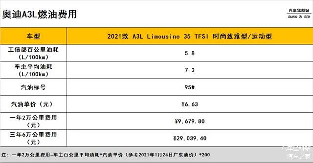 奥迪A3L的官方百公里油耗为5.8L,由于是新款车型,目前暂未有车主平均油耗数据,因此我们以旧款车型的7.3L车主平均油耗进行计算,结果如下: