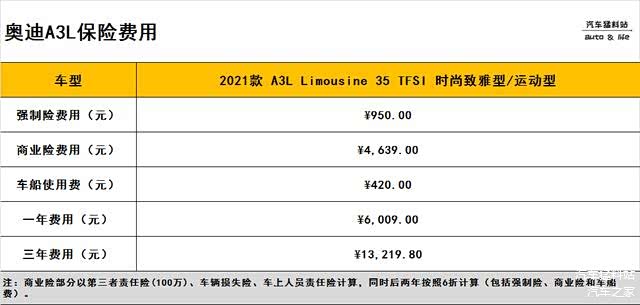 保险费用方面其实各品牌车型间差异不大,更多的差异在于车身价格以及所选择的险种,那么奥迪A3L的表现如何呢,我们通过下表可得到答案: