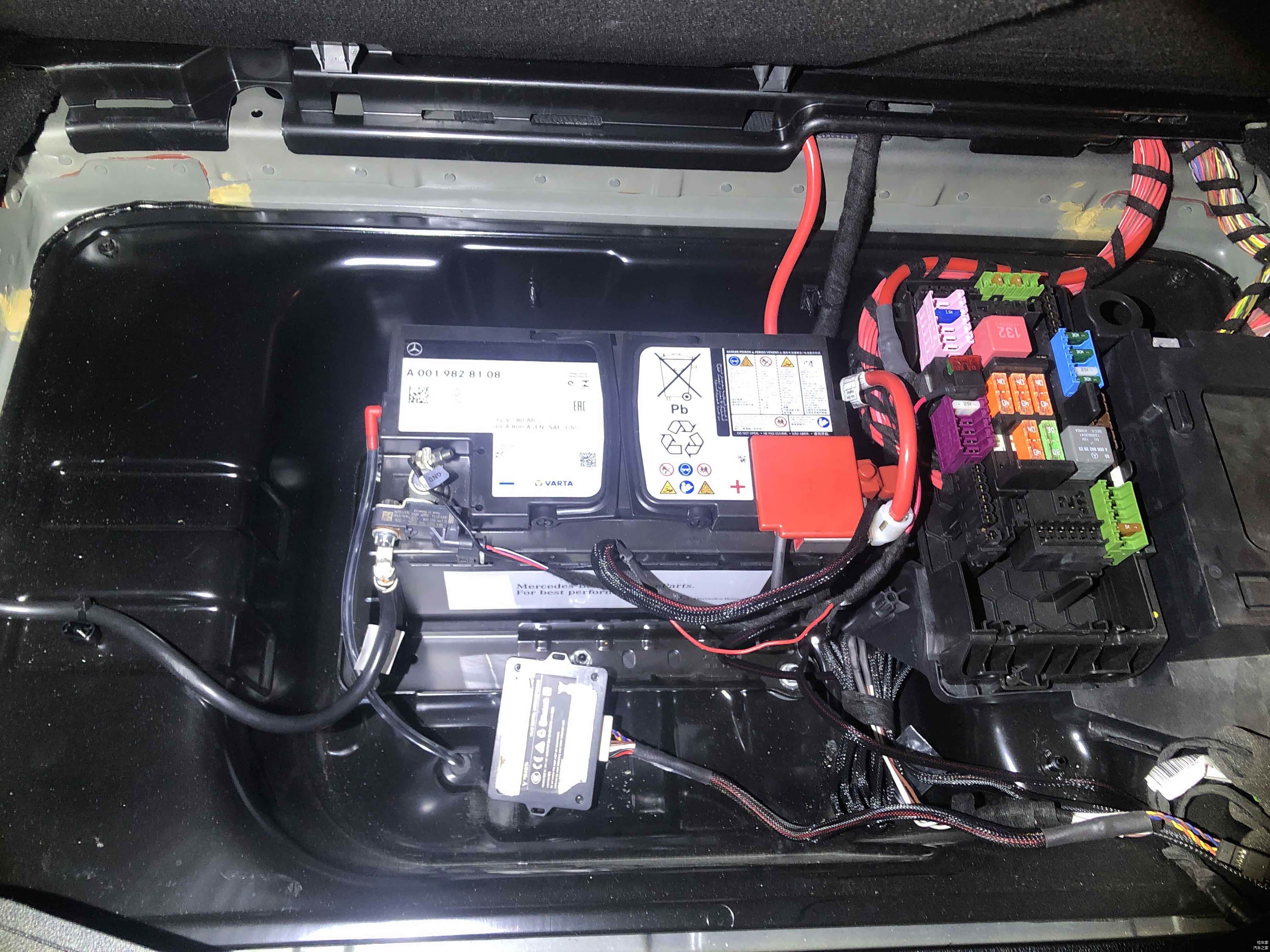 接着来看看后备箱,这车是没有备胎的,备胎框内是蓄电池和保险丝盒。